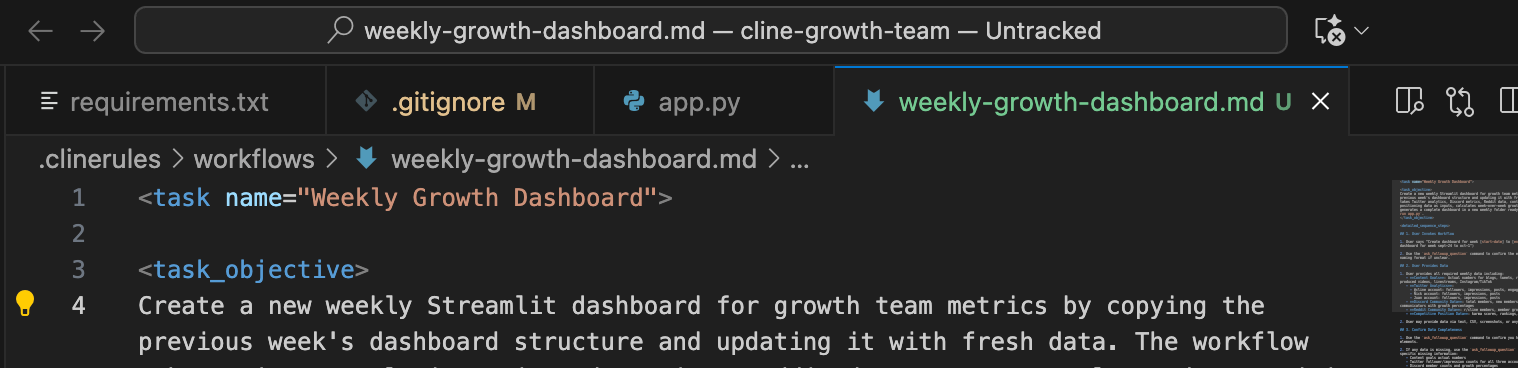 Now when I need the weekly dashboard, I type /weekly-dashboard.md. Cline asks for the data inputs, calculates week-over-week comparisons, generates all the visualizations, and outputs a complete dashboard ready to run. What took 30 minutes of back-and-forth now happens in one command.