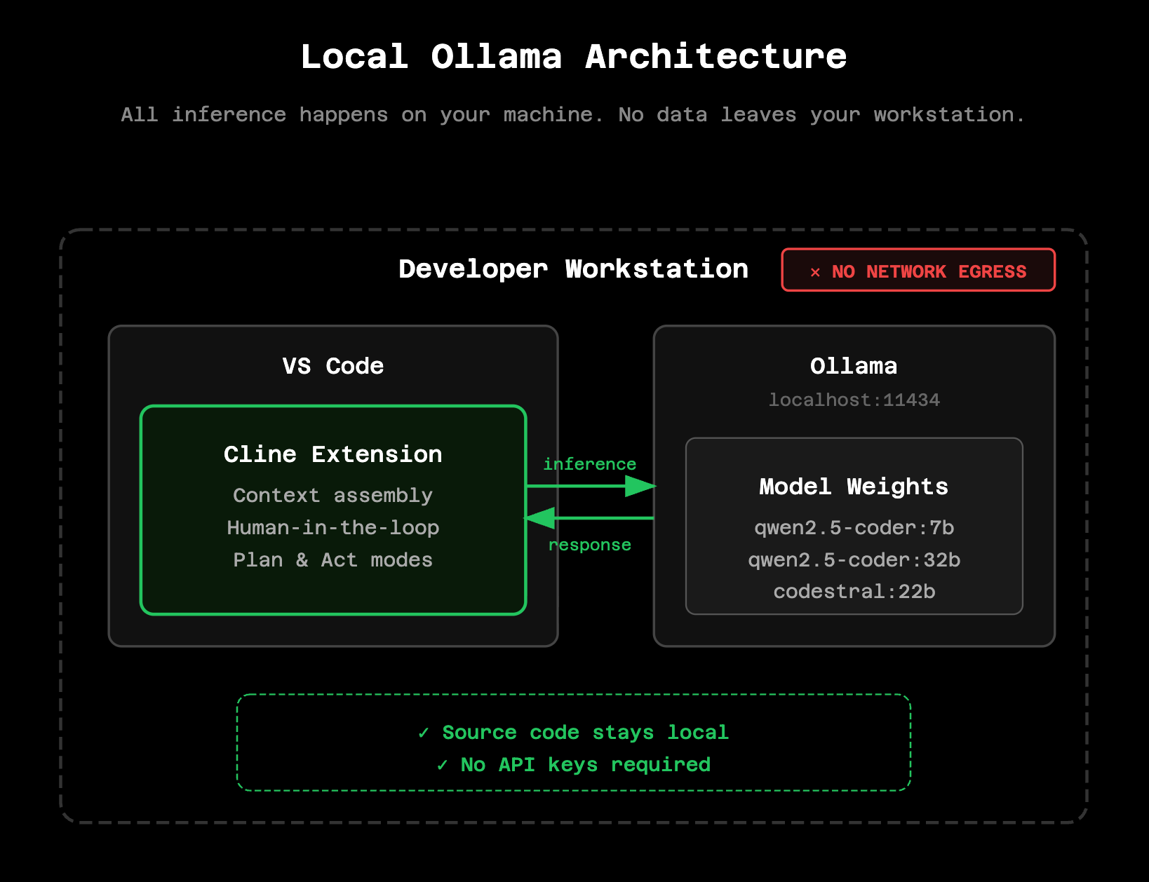 For individual developers who want to evaluate this architecture before proposing it to their organization, you can run Cline entirely offline in under 10 minutes. No cloud dependencies, no API keys, no data leaving your machine.