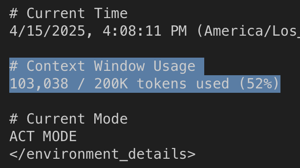 1. Context Window Awareness: Cline internally tracks its context window usage (you can see this percentage in environment_details). It knows when it's approaching limits where performance might degrade (often noticeable past ~50% usage for many models).